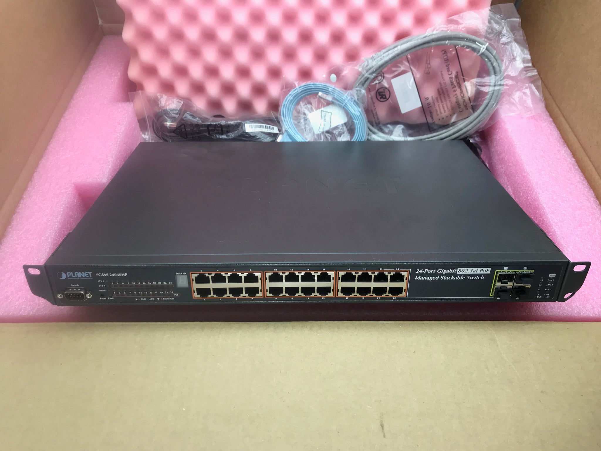 Includes: 1 x Planet SGSW-24040HP 24 Port Gigabit PoE 4 Shared SFP Managed Stackable Switch 1 X Power Cords 1 X Console Cable 1 X Ethernet Cable 1 X Rack Ears (Bent See Pictures) |